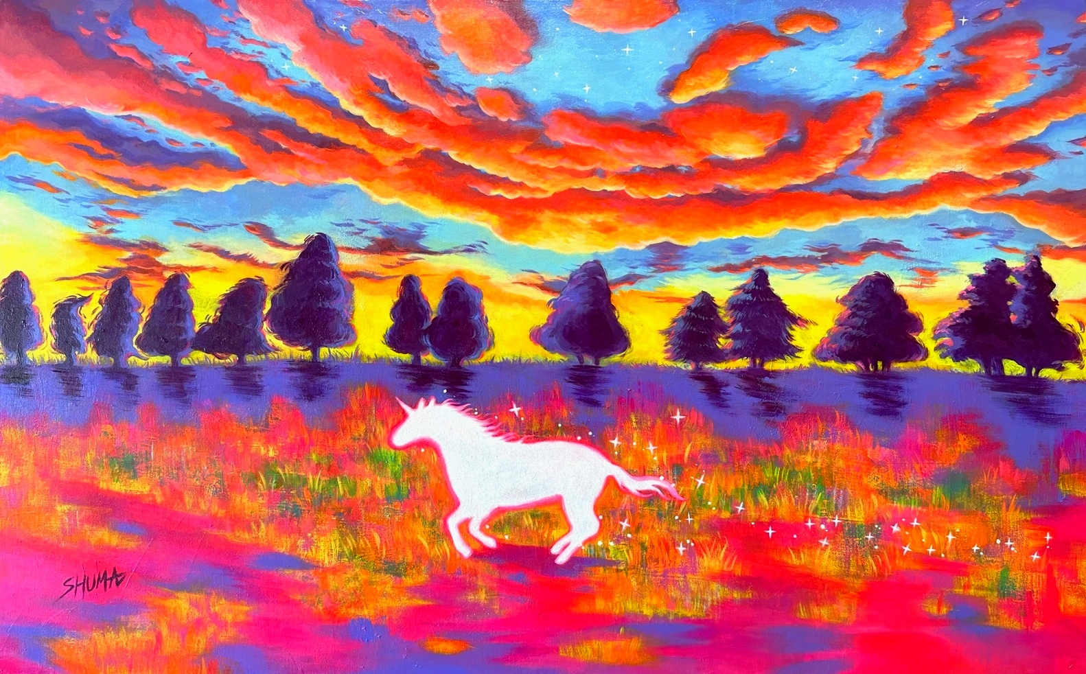 SHUMA喜歡用鮮亮的顏色去包覆畫裡的氛圍,透過筆刷的層層堆疊去描繪虛幻國度的生命力。