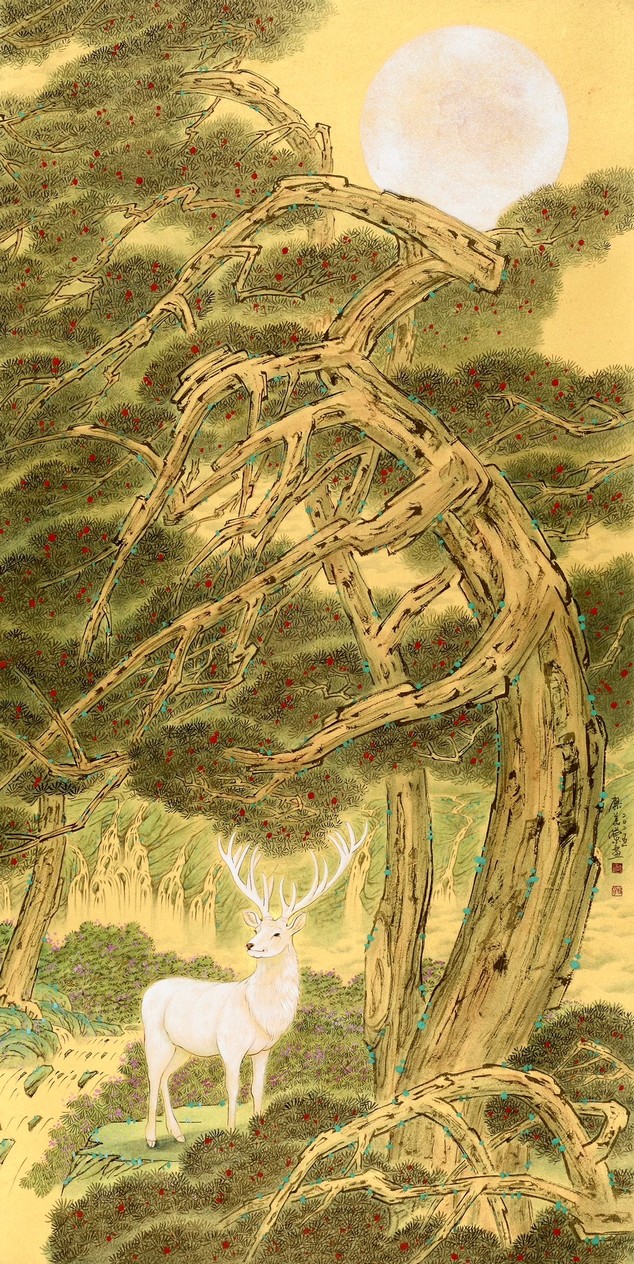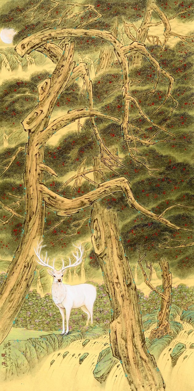 廖美蘭《松月神鹿映千秋》彩墨紙本 50x100cm
