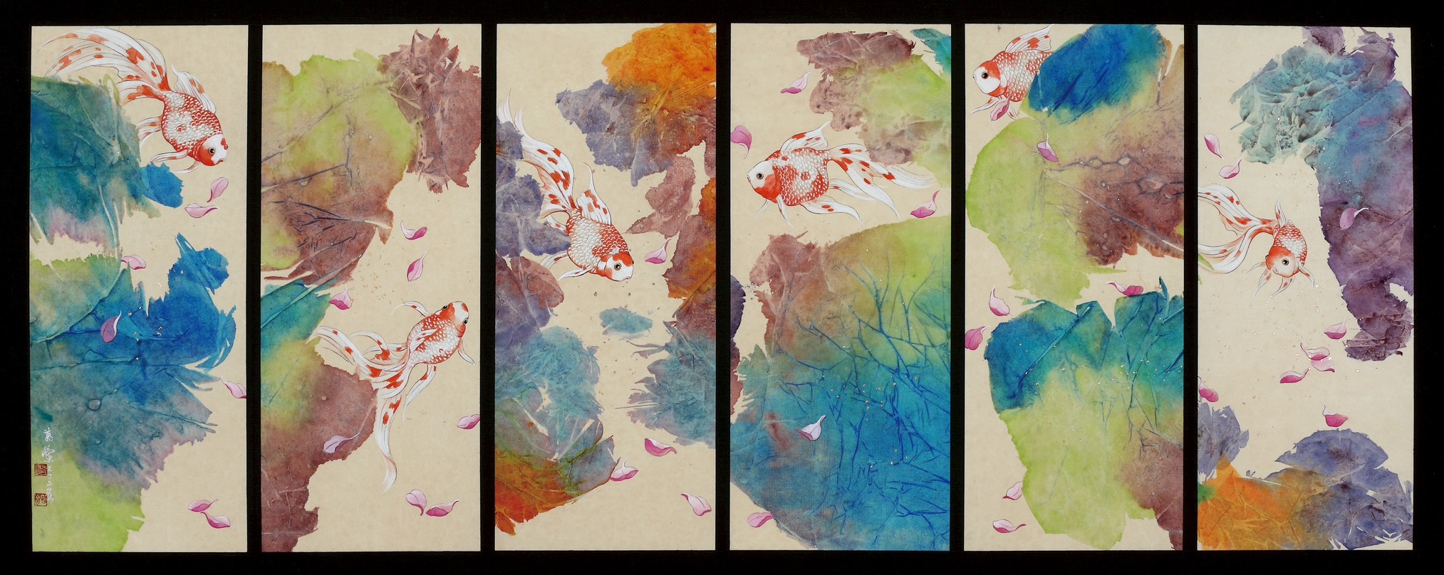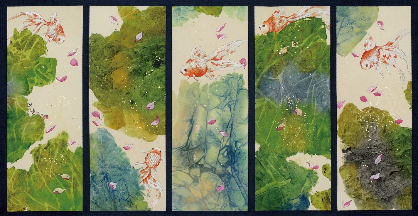 廖美蘭《魚戲–五福臨門》彩墨紙本 66x35cm