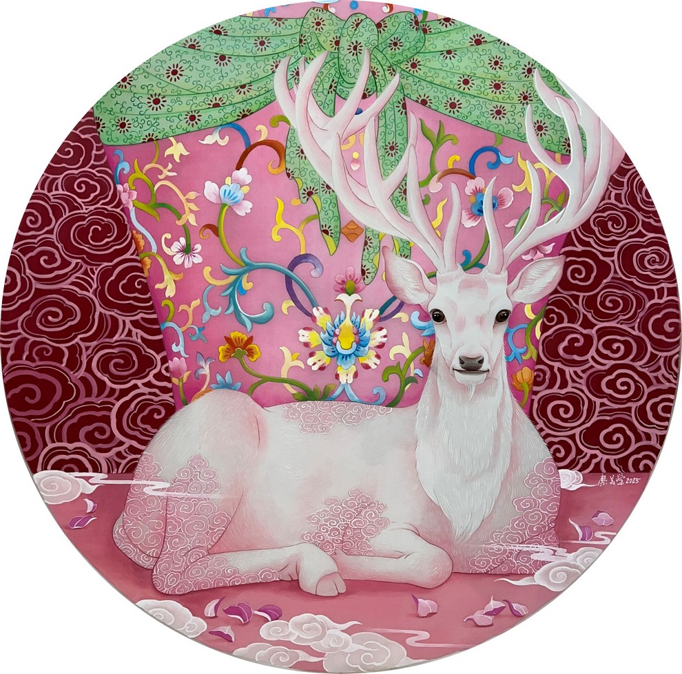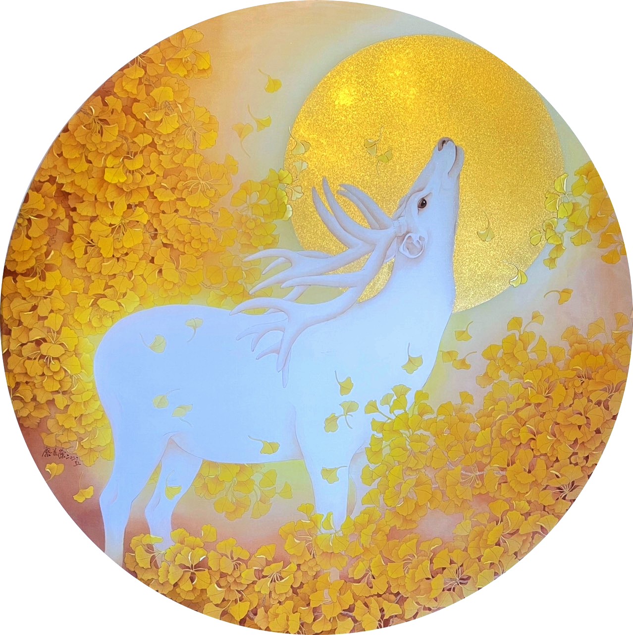 廖美蘭《 金秋華月迎祥鹿》膠彩絹本 直徑70cm