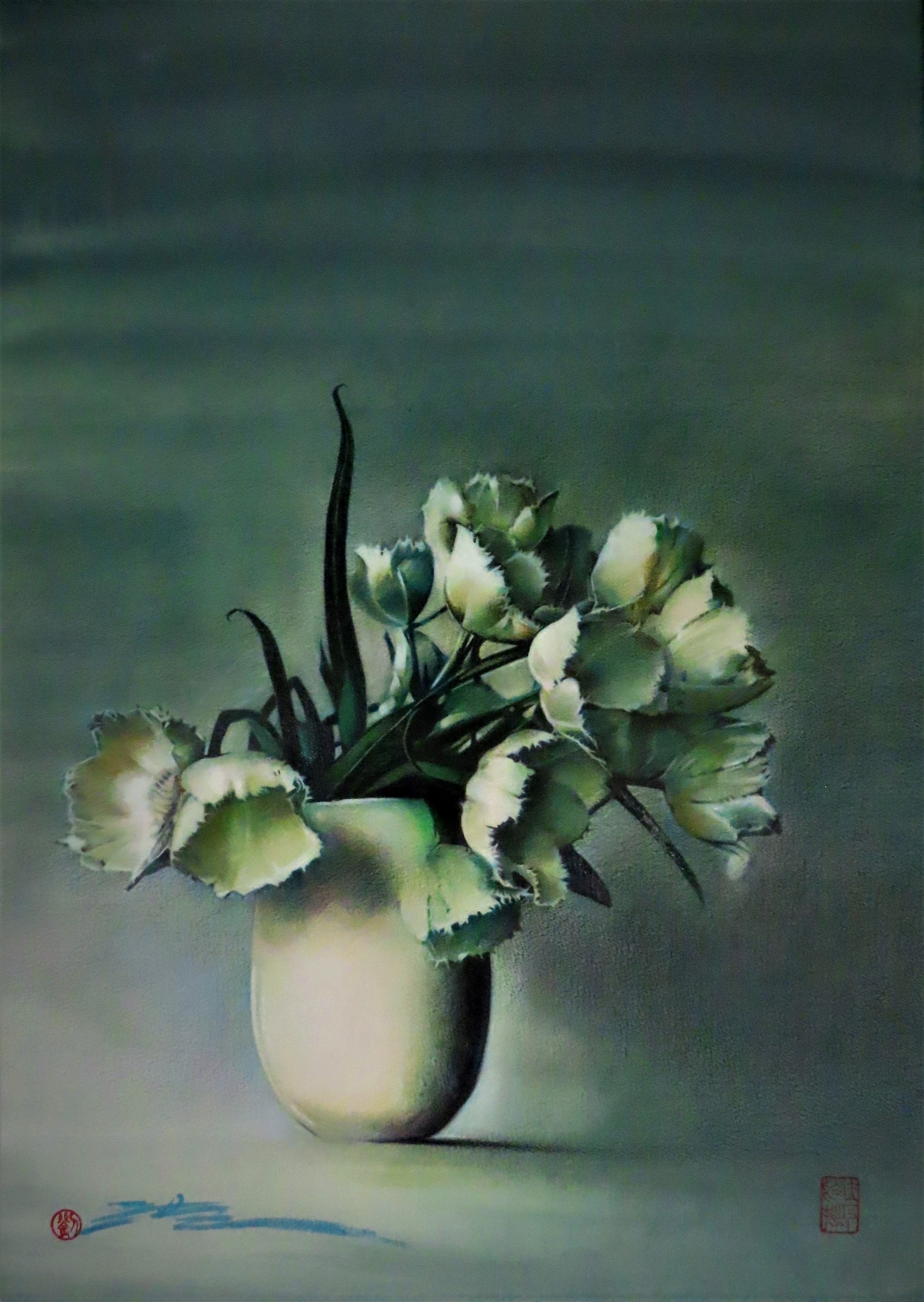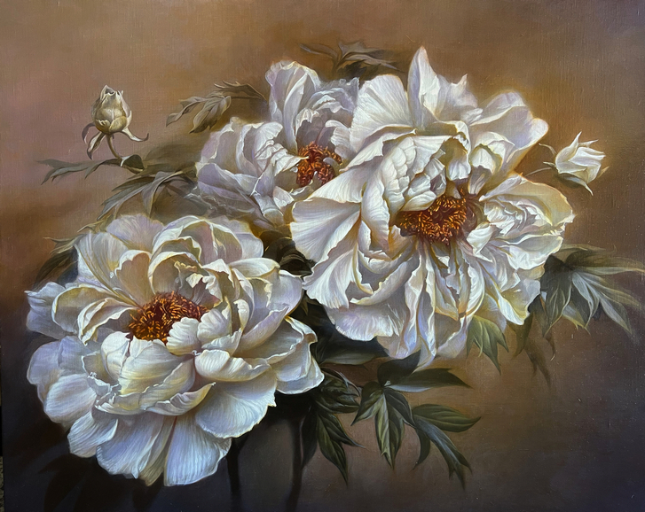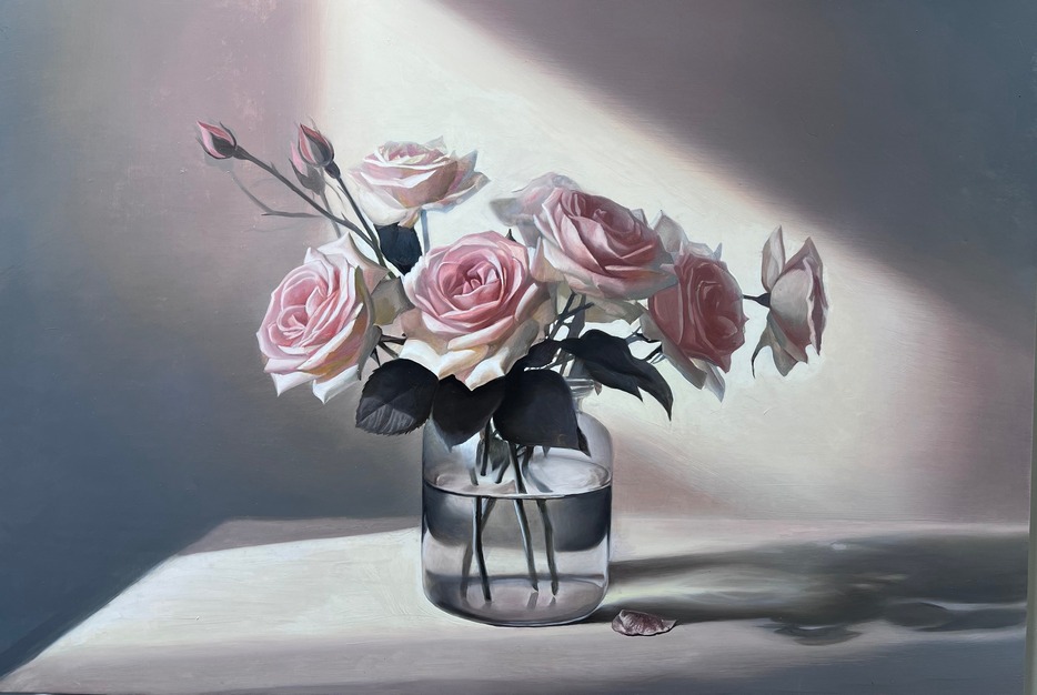 透過藝術家的眼睛,花卉不只是花卉,也可以是一幅幅的肖像畫。藝術家以油畫表現牡丹時,如同寫長篇章回小說,慢慢鋪陳引人入勝,表現牡丹的靜謐氣質,藝術家以水彩表現牡丹時,又猶如寫詩,掌握瞬間的美感,擬虛為實,擬實為虛,以一寓萬,意在弦外,藉由這樣不同的方式,開展繪畫創作的自由度。今年藝術家透過壓克力顏料來描繪風景,多以簡潔的筆觸和灰階色系為基底,營造出溫柔且深遠的氣氛。色塊之間的空隙,也讓觀者多了一份靜思的空間。這不是炫目的風景畫,而是一種內在節奏的延伸。