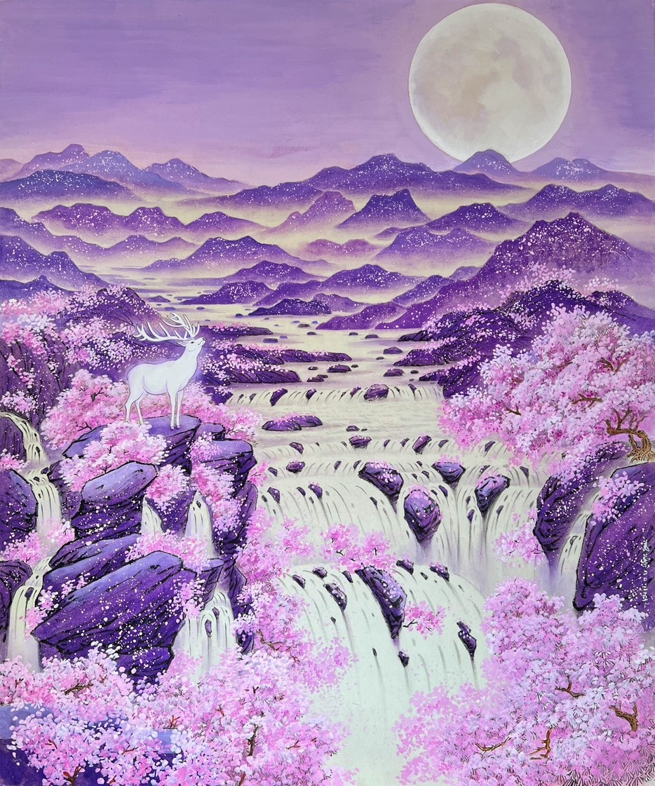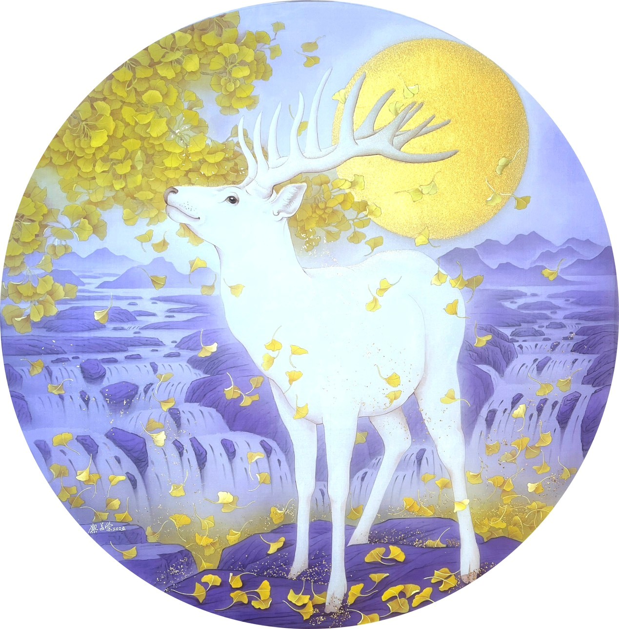 廖美蘭《 紫瀑金月福鹿來》膠彩絹本 直徑70cm