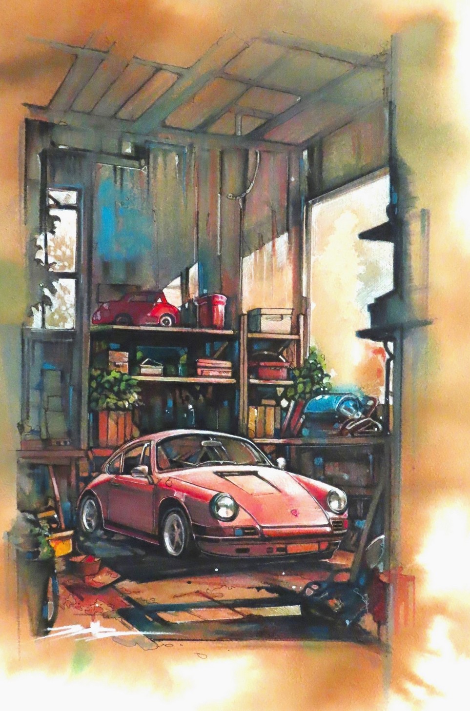 劉漢文《靜謐的午後修車場》複合媒材,紙本 36x53cm