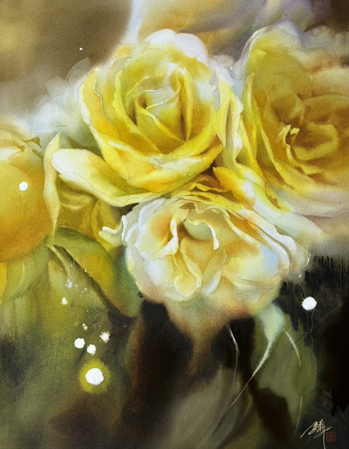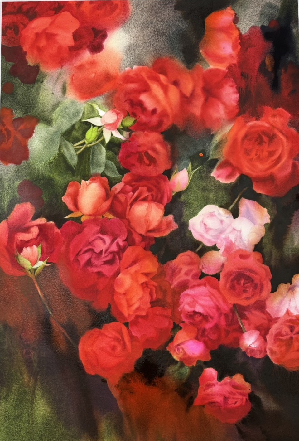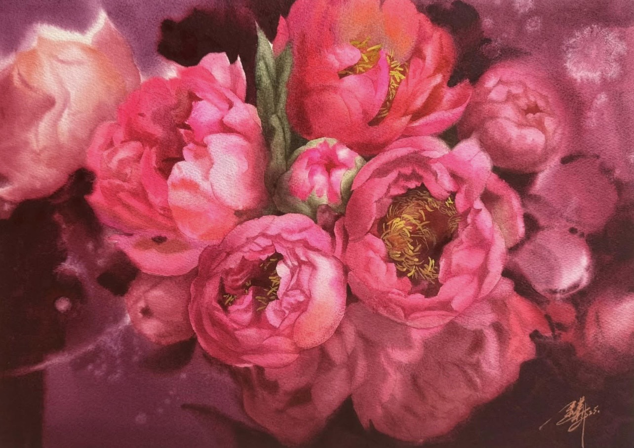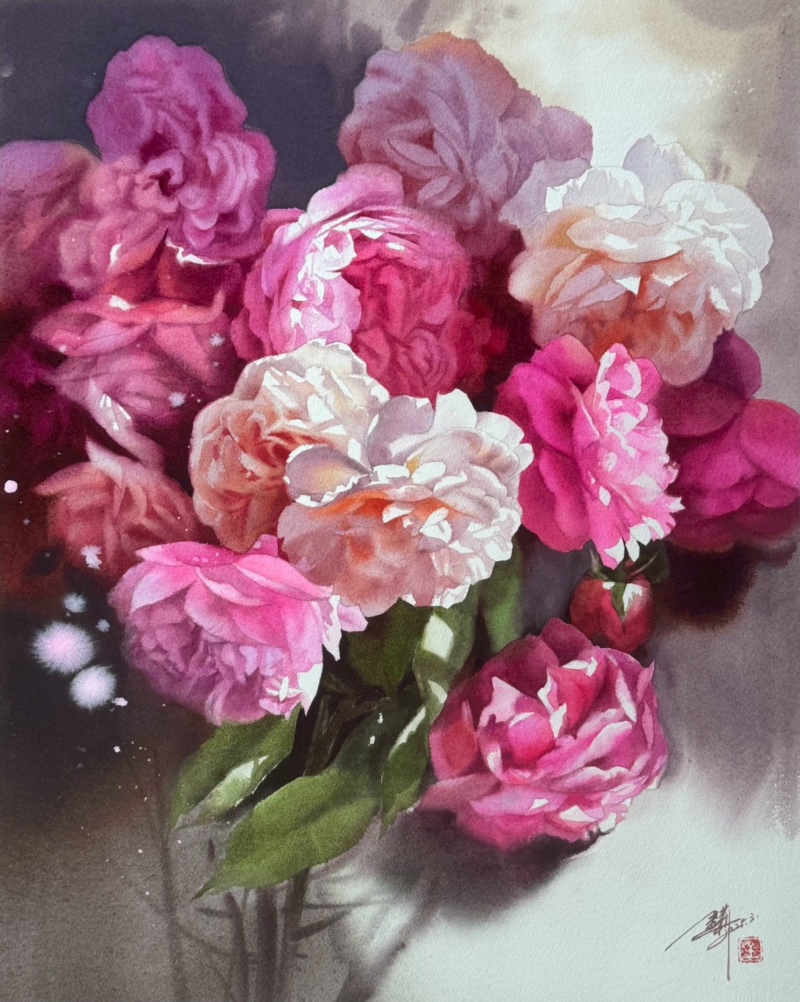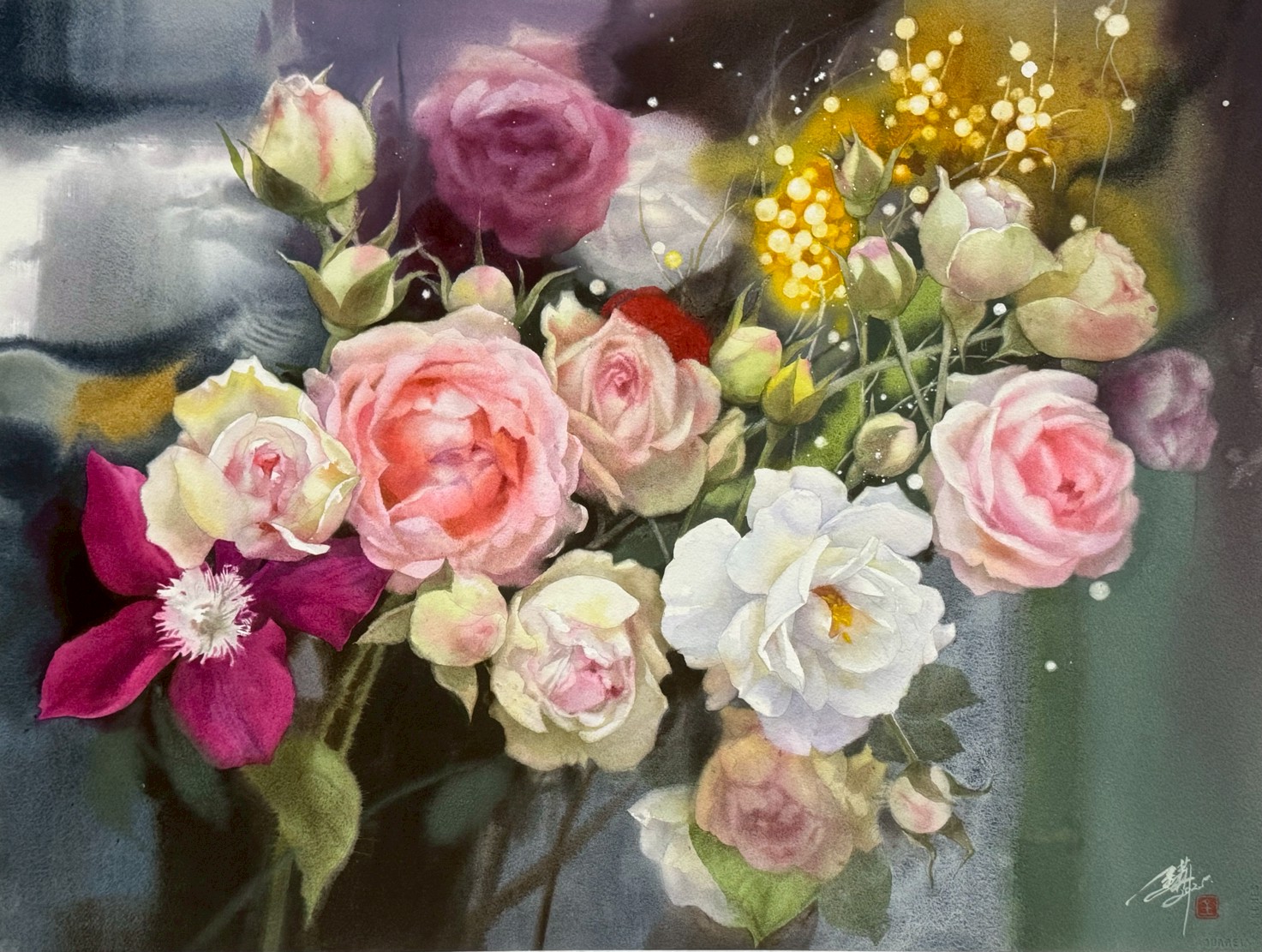 金莉老師擅長使用水彩創作,尤以花卉題材最為出類拔萃,對於花卉結構的精確掌握,使其能大膽運用高飽和度的色彩而不失雅致,精采的光影對比營造出戲劇張力的畫面,不論是晨間玫瑰的溫柔光茫,或重瓣牡丹深邃的暗部層次,皆展現出深厚的控水功力與色彩哲學。從清晨的初露到午後的驕陽,在藝術家匠心獨運的演繹下,捕捉每一朵玫瑰最動人的瞬間。