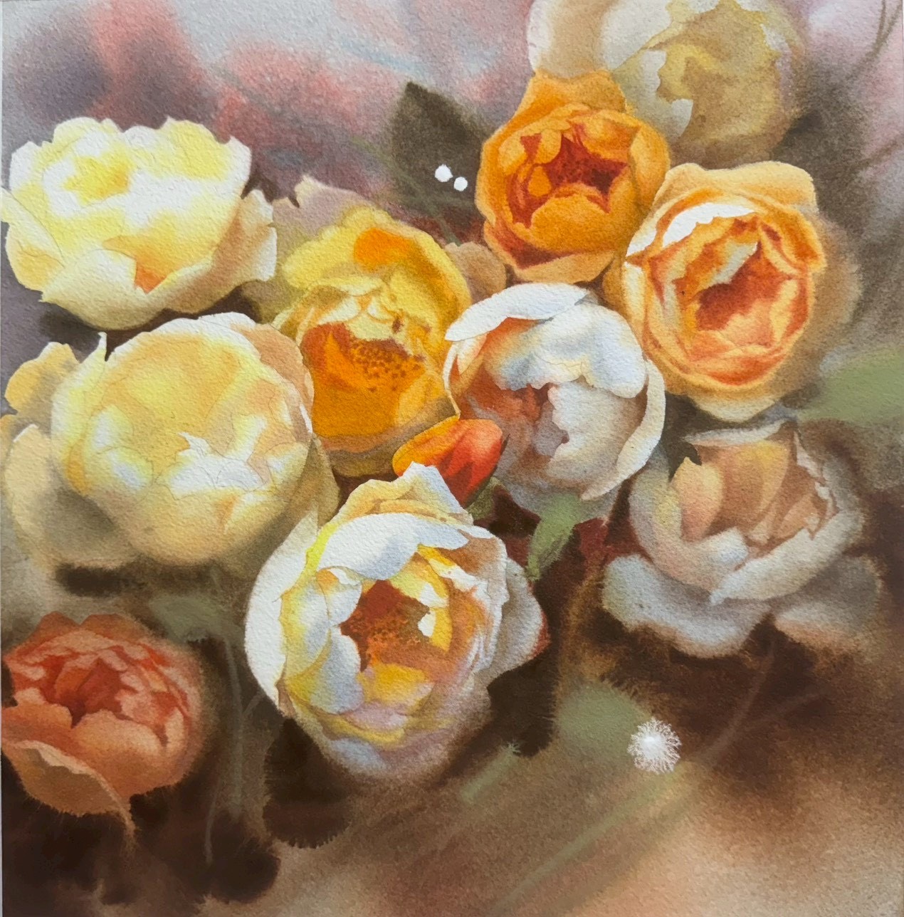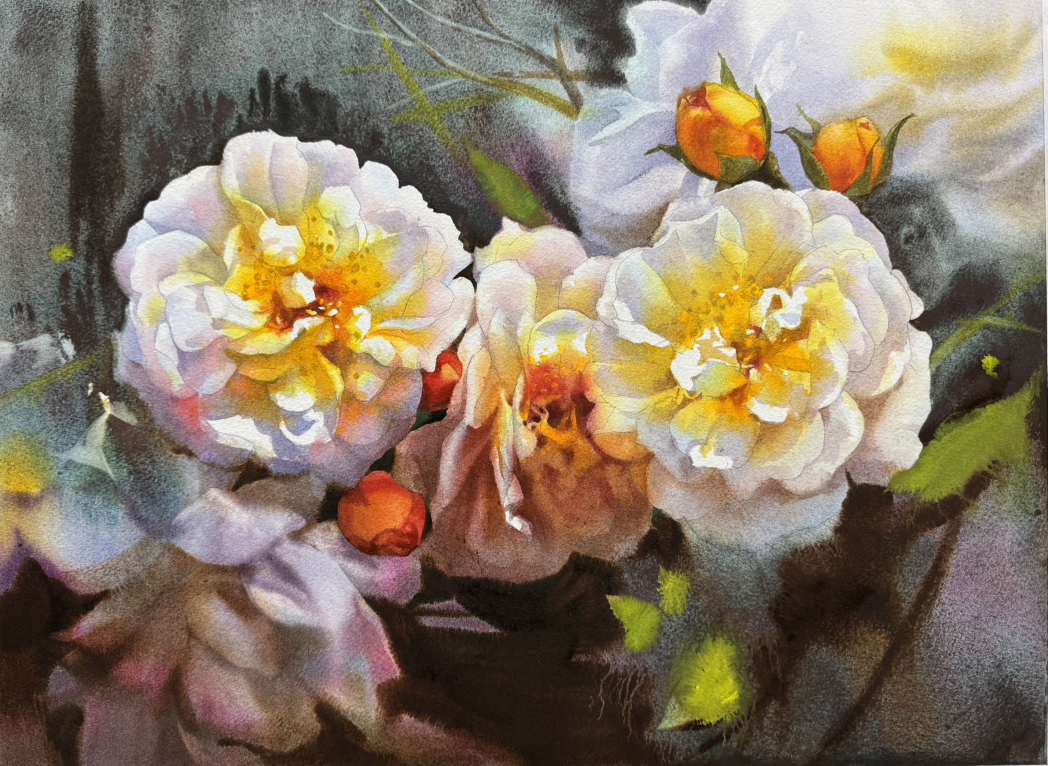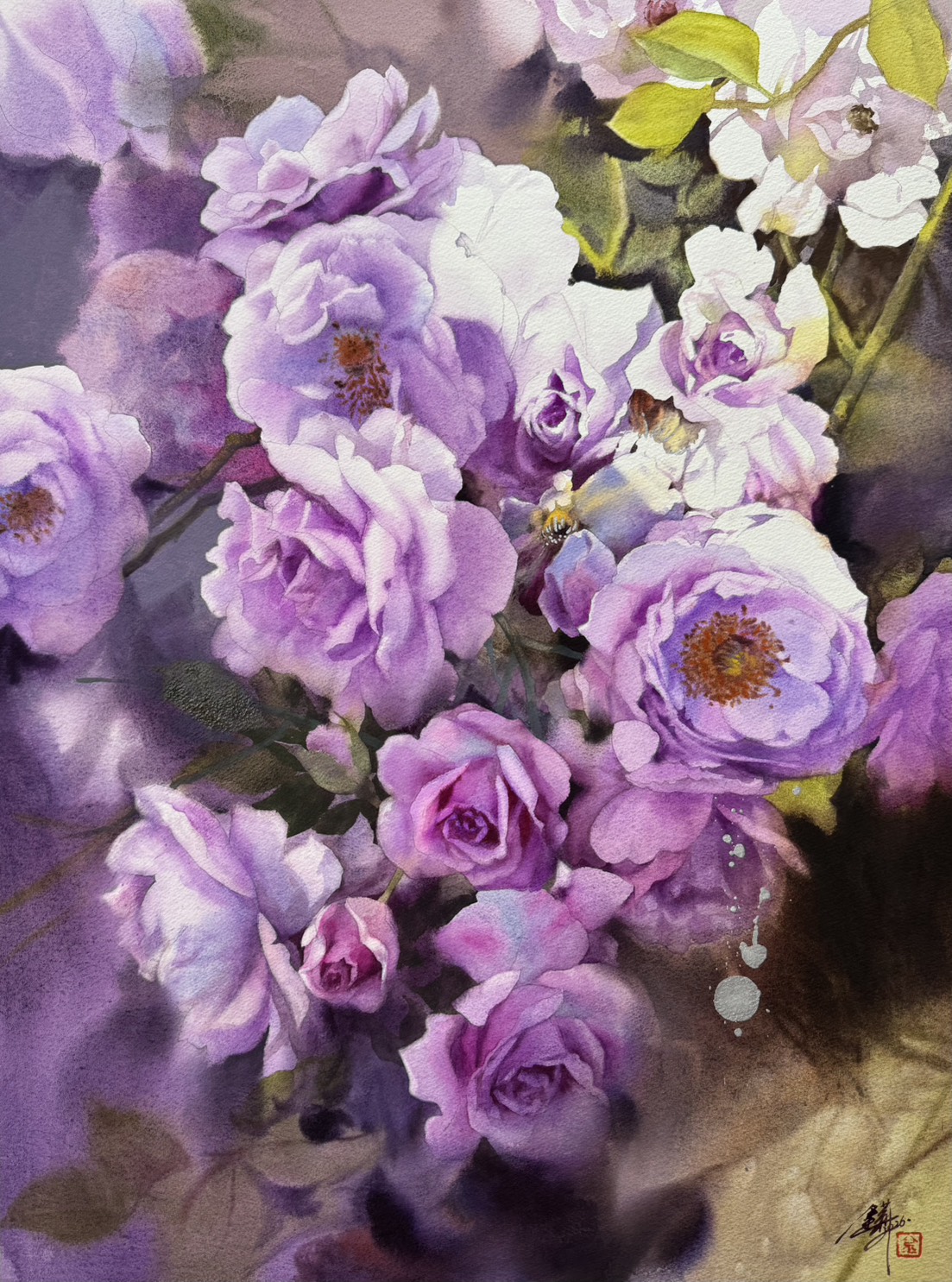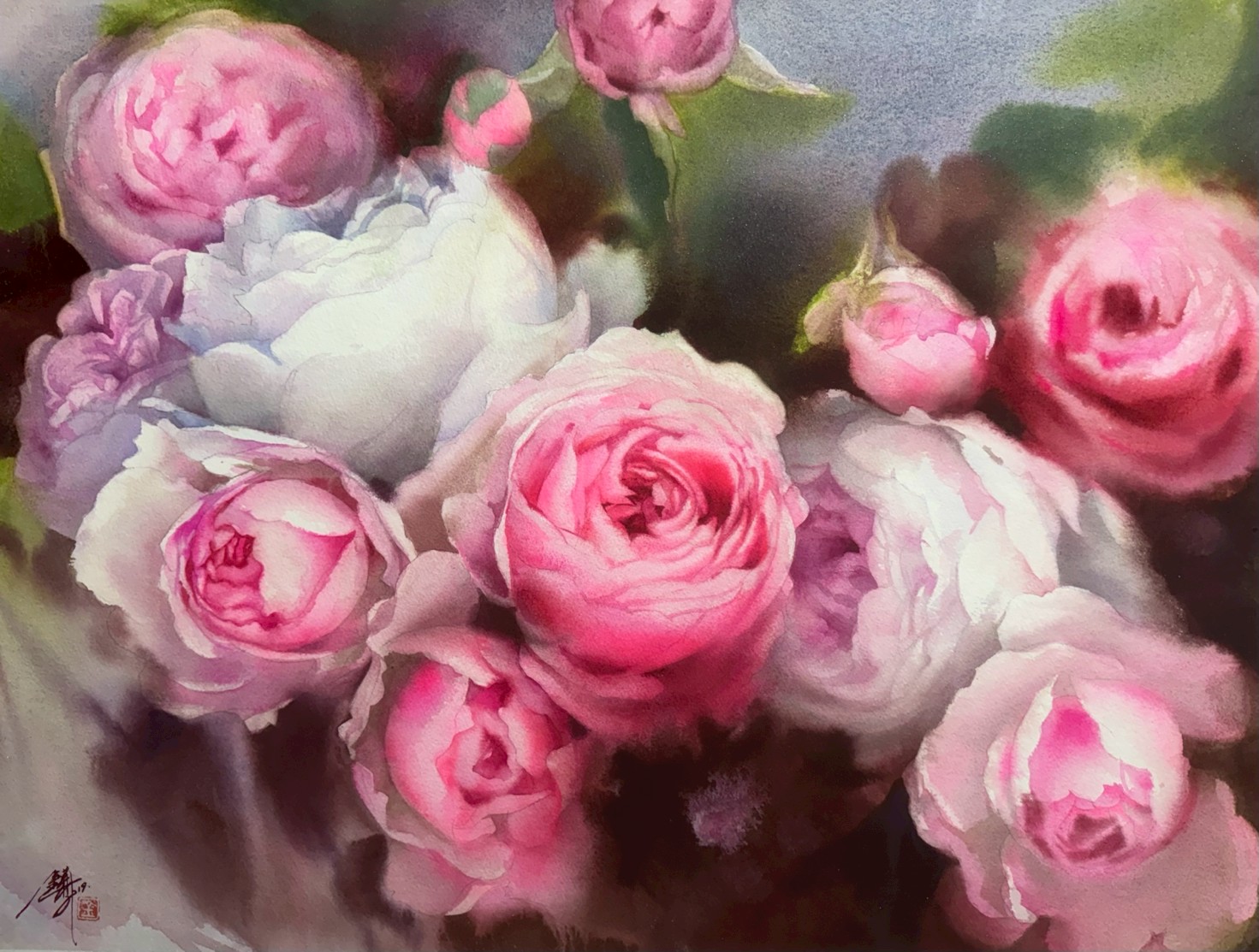 金莉老師擅長使用水彩創作,尤以花卉題材最為出類拔萃,對於花卉結構的精確掌握,使其能大膽運用高飽和度的色彩而不失雅致,精采的光影對比營造出戲劇張力的畫面,不論是晨間玫瑰的溫柔光茫,或重瓣牡丹深邃的暗部層次,皆展現出深厚的控水功力與色彩哲學。從清晨的初露到午後的驕陽,在藝術家匠心獨運的演繹下,捕捉每一朵玫瑰最動人的瞬間。