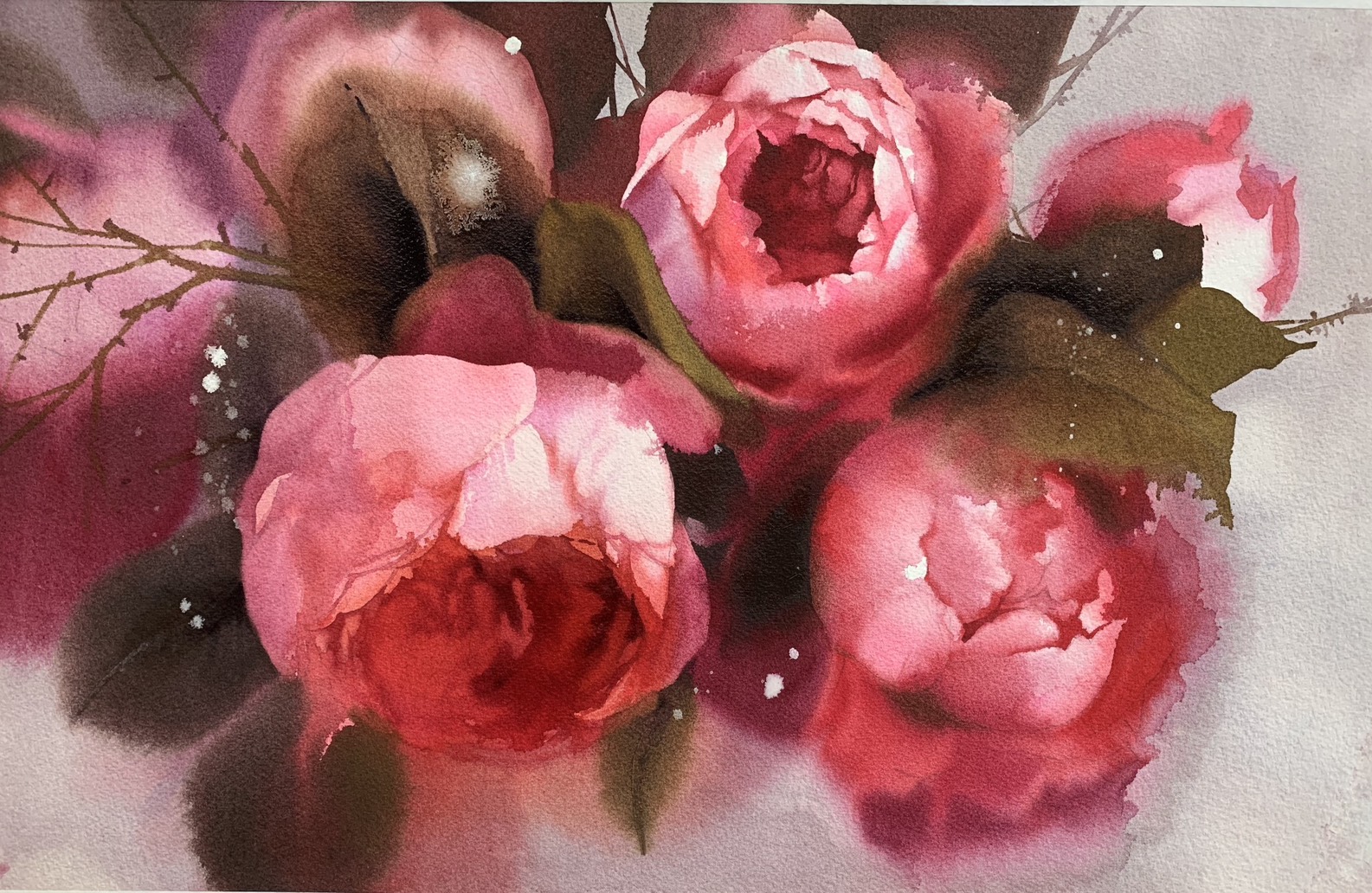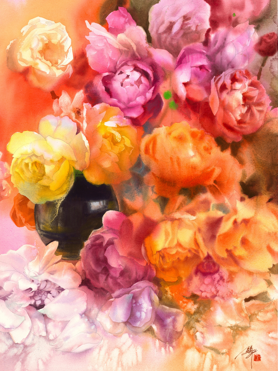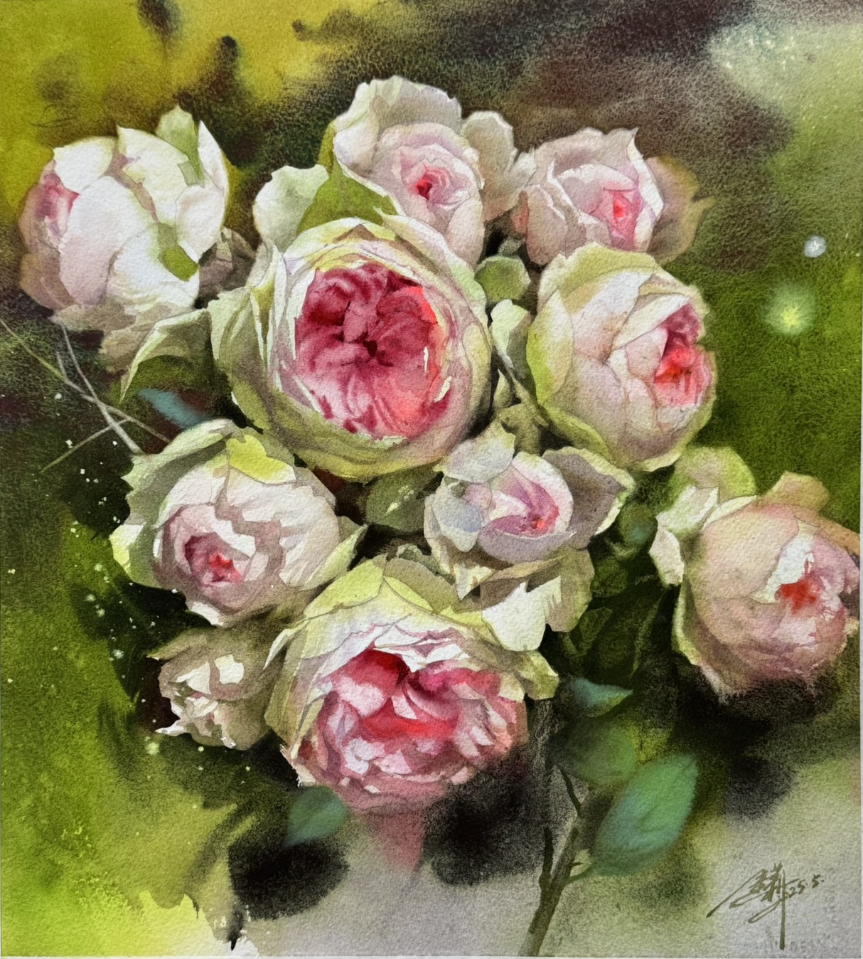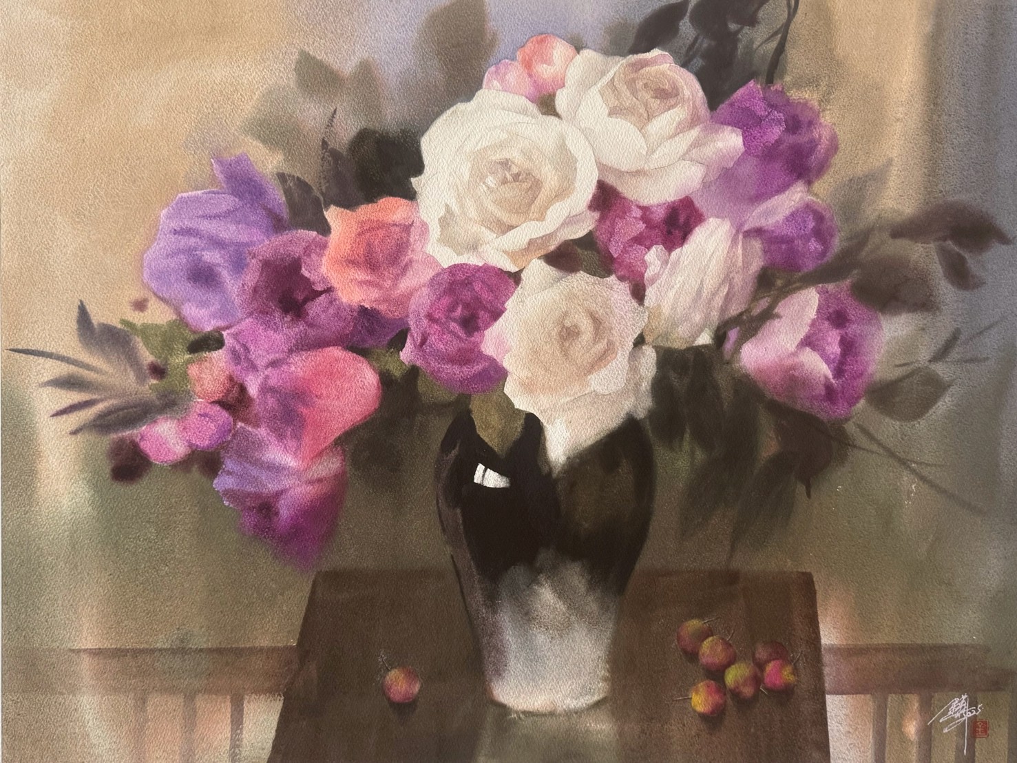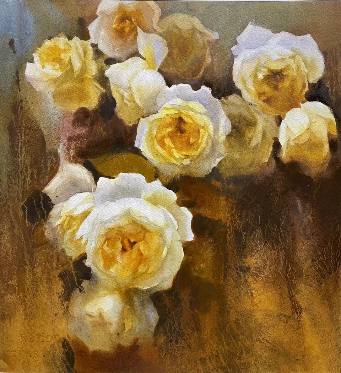 金莉老師擅長使用水彩創作,尤以花卉題材最為出類拔萃,對於花卉結構的精確掌握,使其能大膽運用高飽和度的色彩而不失雅致,精采的光影對比營造出戲劇張力的畫面,不論是晨間玫瑰的溫柔光茫,或重瓣牡丹深邃的暗部層次,皆展現出深厚的控水功力與色彩哲學。從清晨的初露到午後的驕陽,在藝術家匠心獨運的演繹下,捕捉每一朵玫瑰最動人的瞬間。