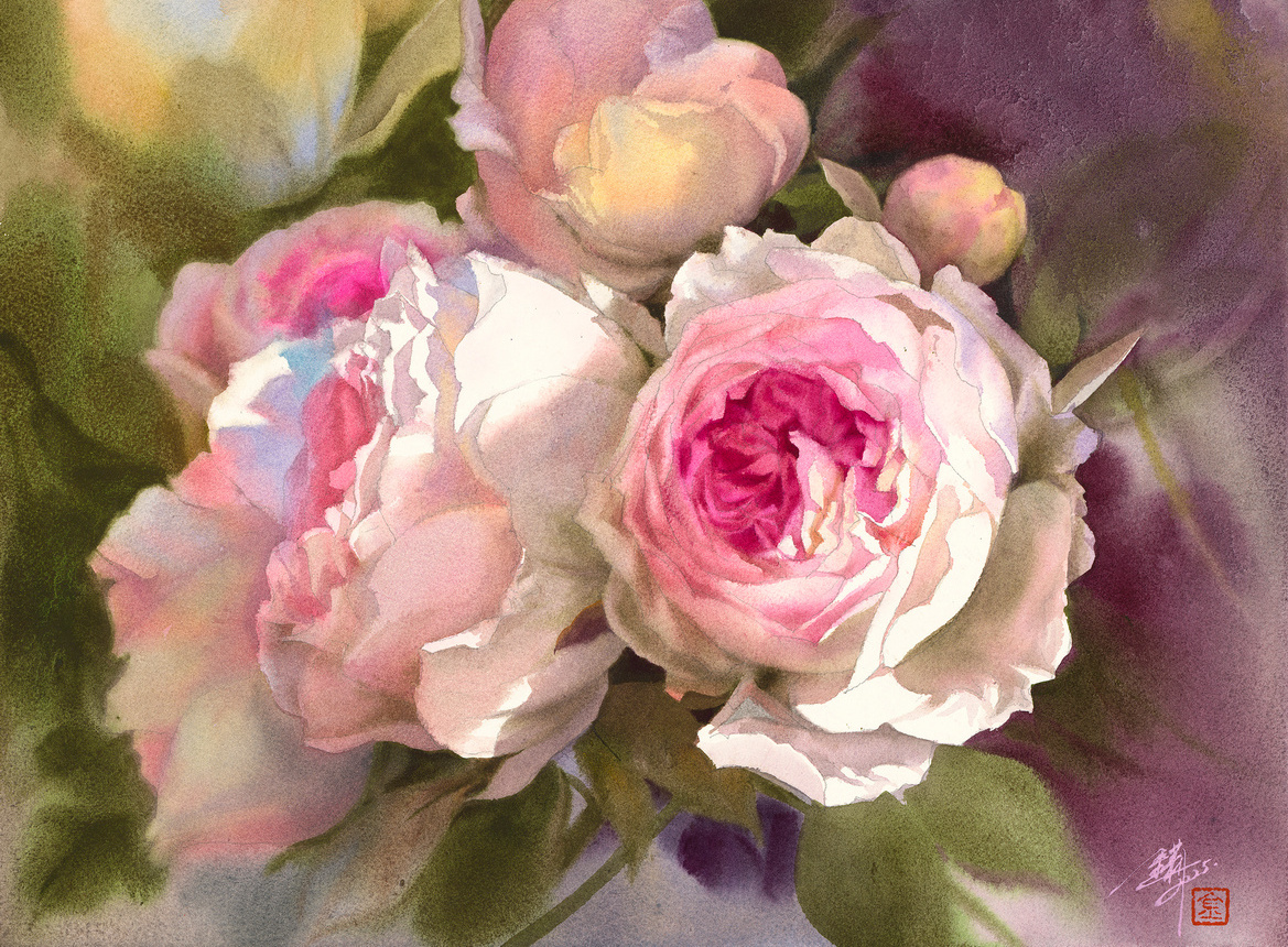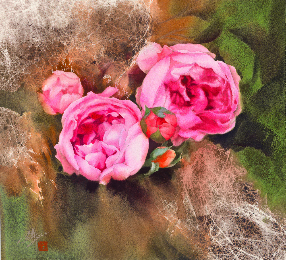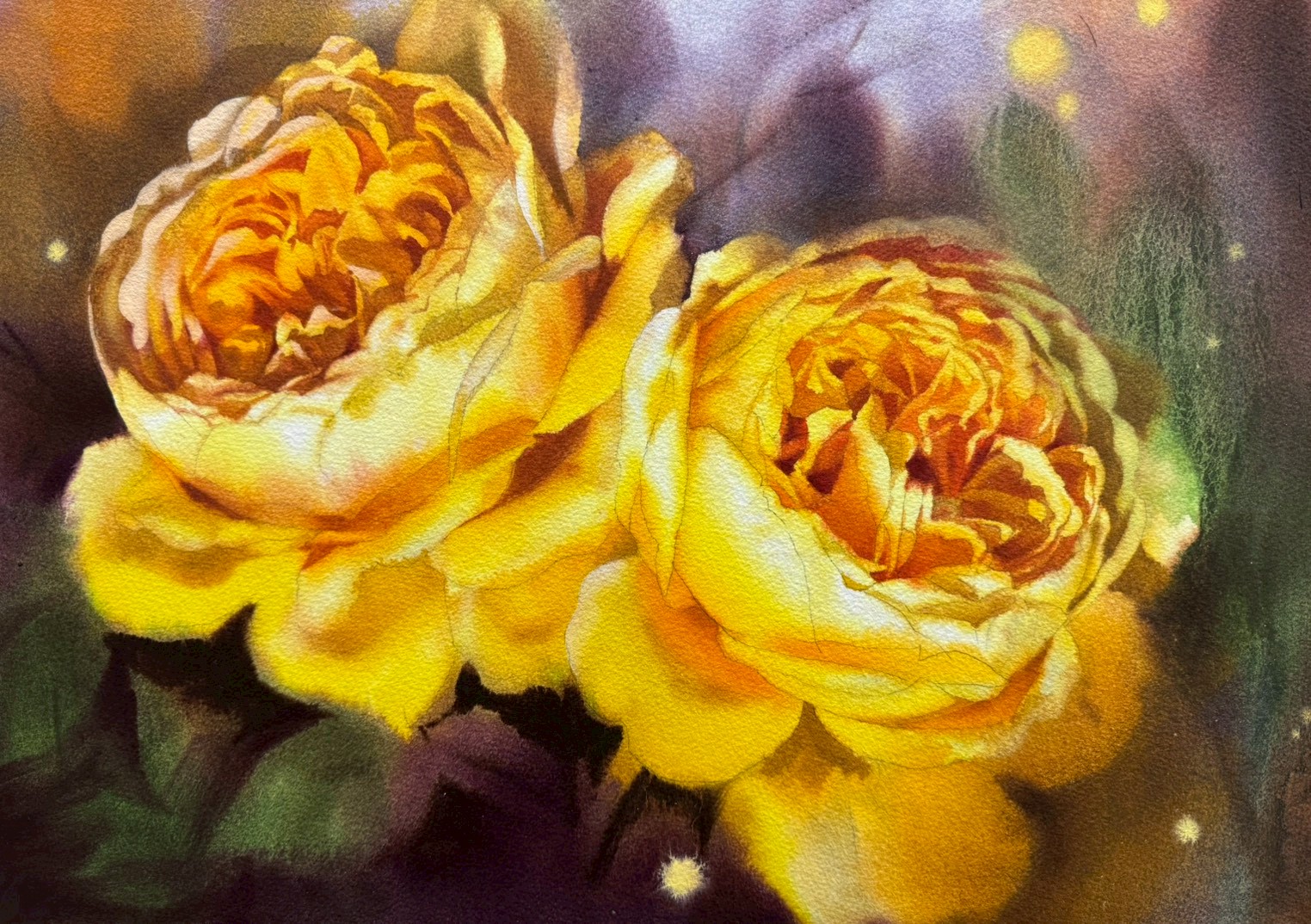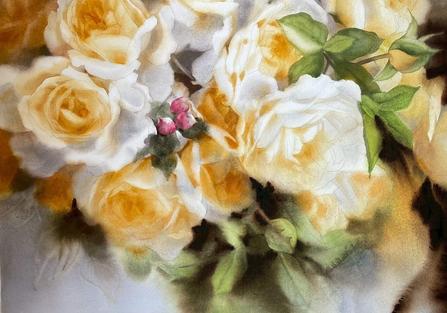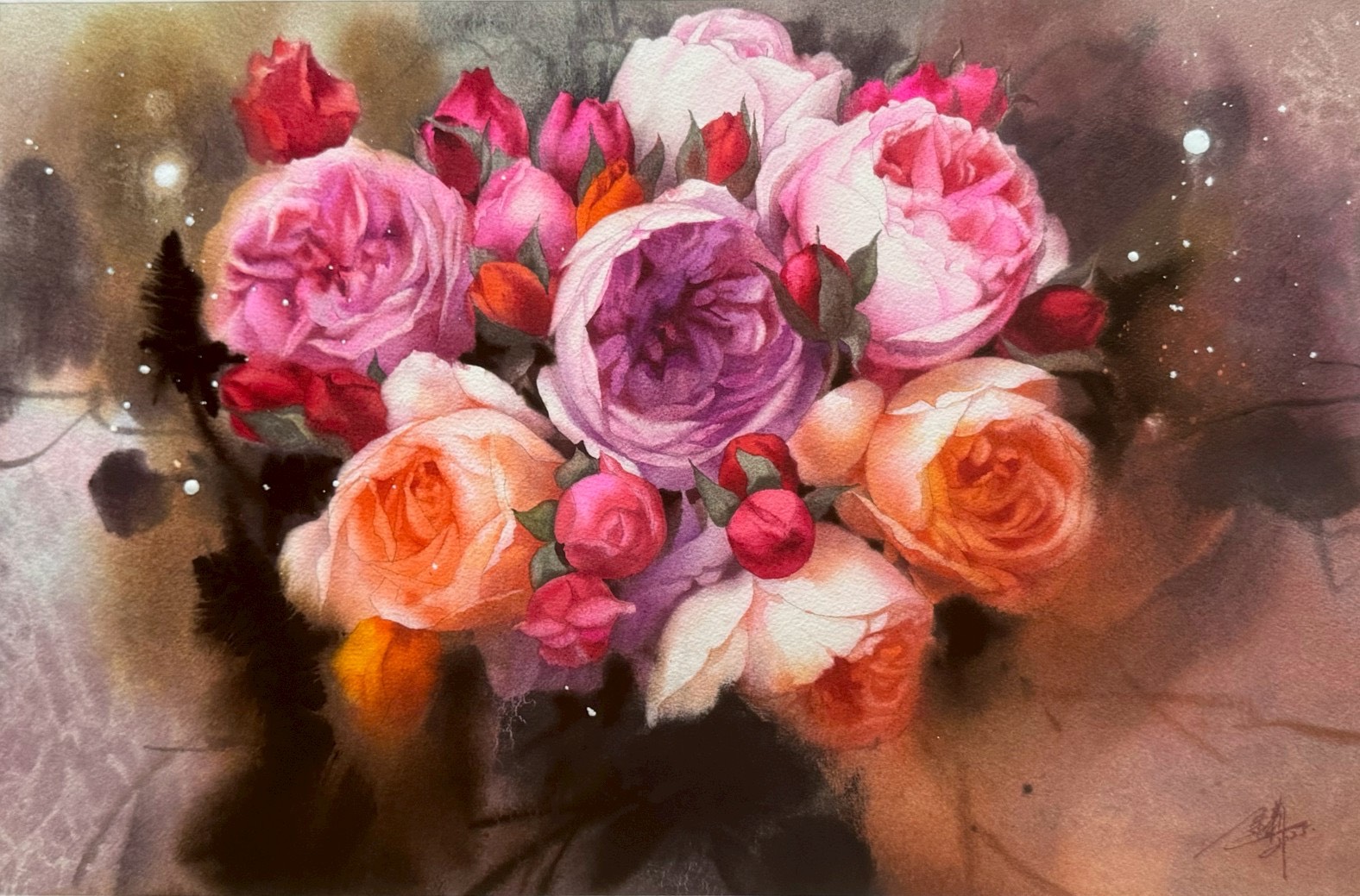 金莉老師擅長使用水彩創作,尤以花卉題材最為出類拔萃,對於花卉結構的精確掌握,使其能大膽運用高飽和度的色彩而不失雅致,精采的光影對比營造出戲劇張力的畫面,不論是晨間玫瑰的溫柔光茫,或重瓣牡丹深邃的暗部層次,皆展現出深厚的控水功力與色彩哲學。從清晨的初露到午後的驕陽,在藝術家匠心獨運的演繹下,捕捉每一朵玫瑰最動人的瞬間。