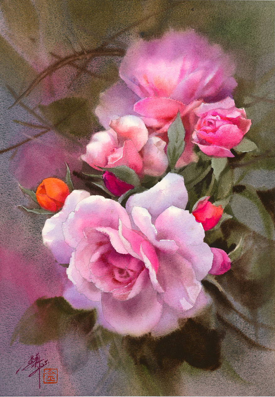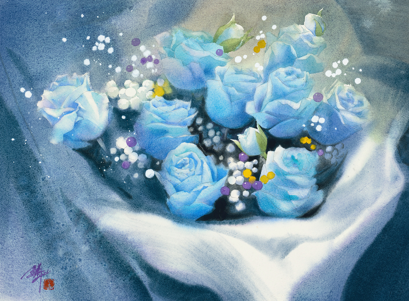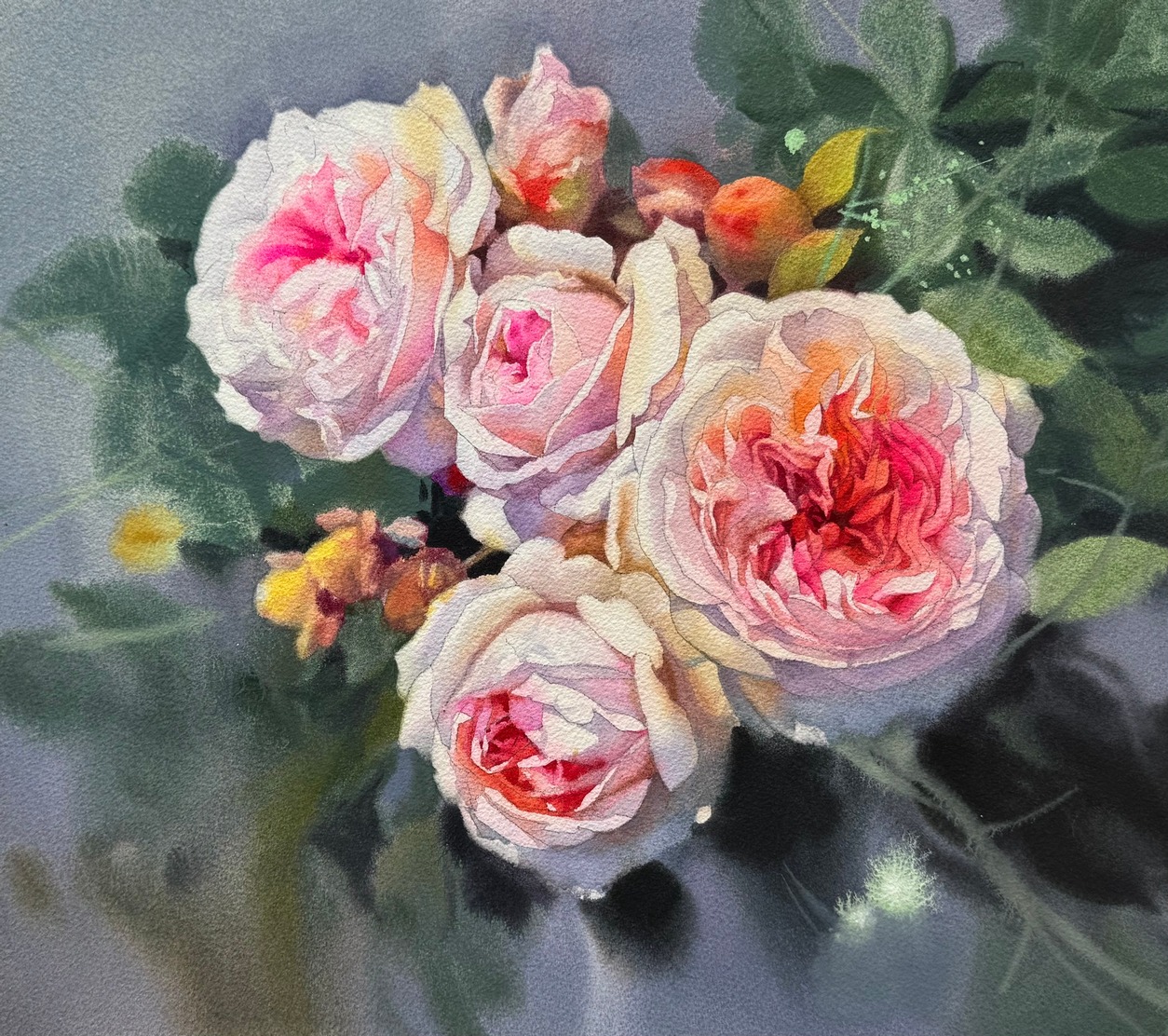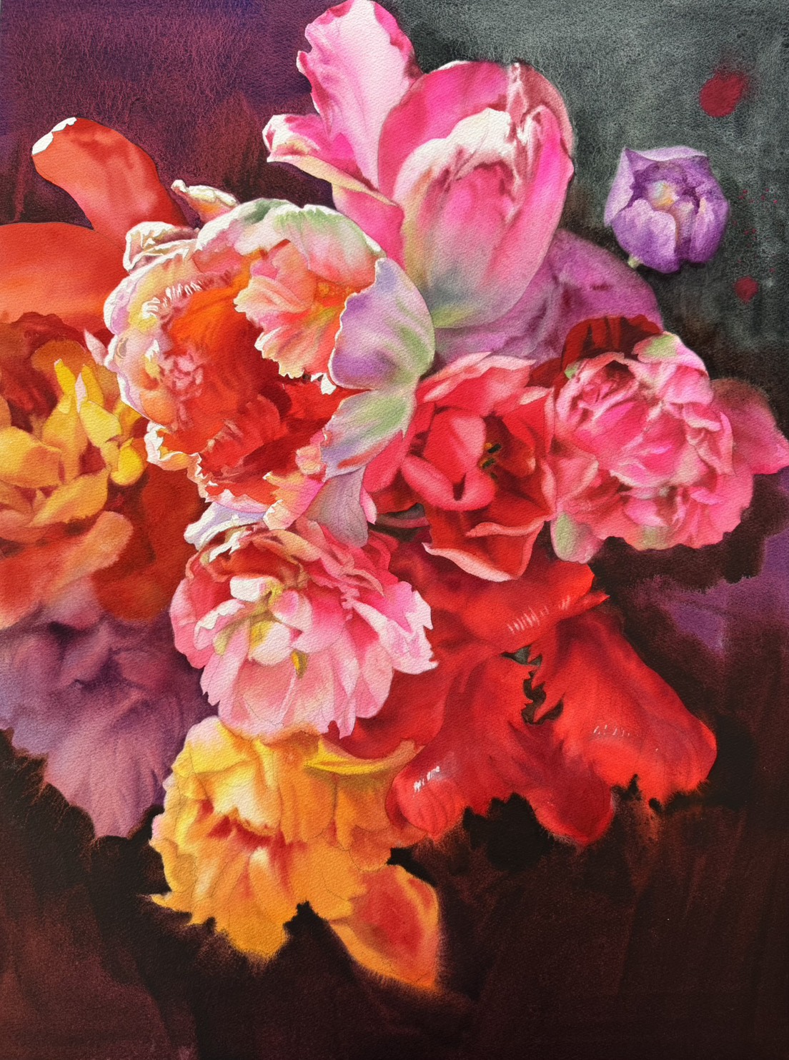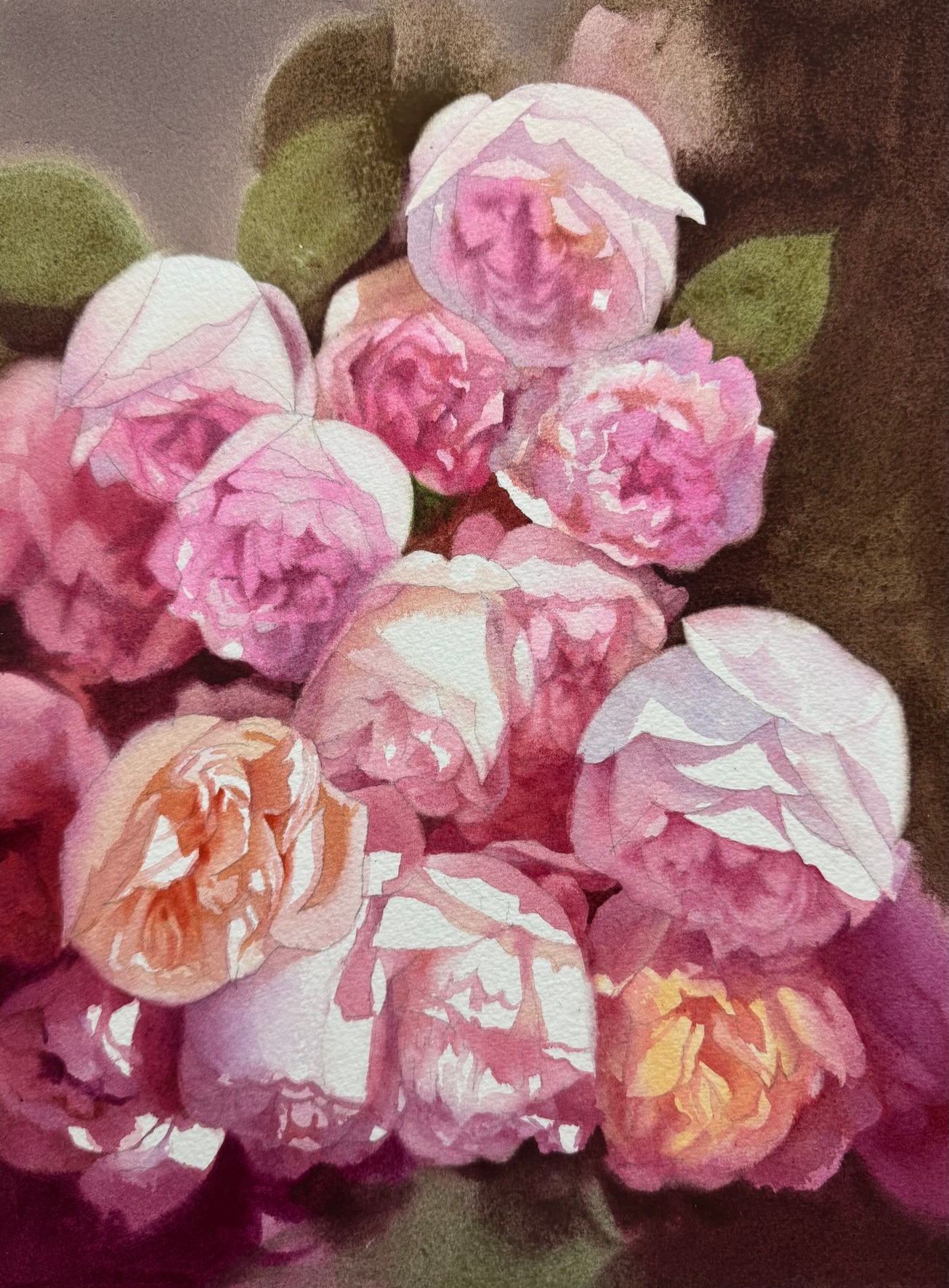 金莉老師擅長使用水彩創作,尤以花卉題材最為出類拔萃,對於花卉結構的精確掌握,使其能大膽運用高飽和度的色彩而不失雅致,精采的光影對比營造出戲劇張力的畫面,不論是晨間玫瑰的溫柔光茫,或重瓣牡丹深邃的暗部層次,皆展現出深厚的控水功力與色彩哲學。從清晨的初露到午後的驕陽,在藝術家匠心獨運的演繹下,捕捉每一朵玫瑰最動人的瞬間。