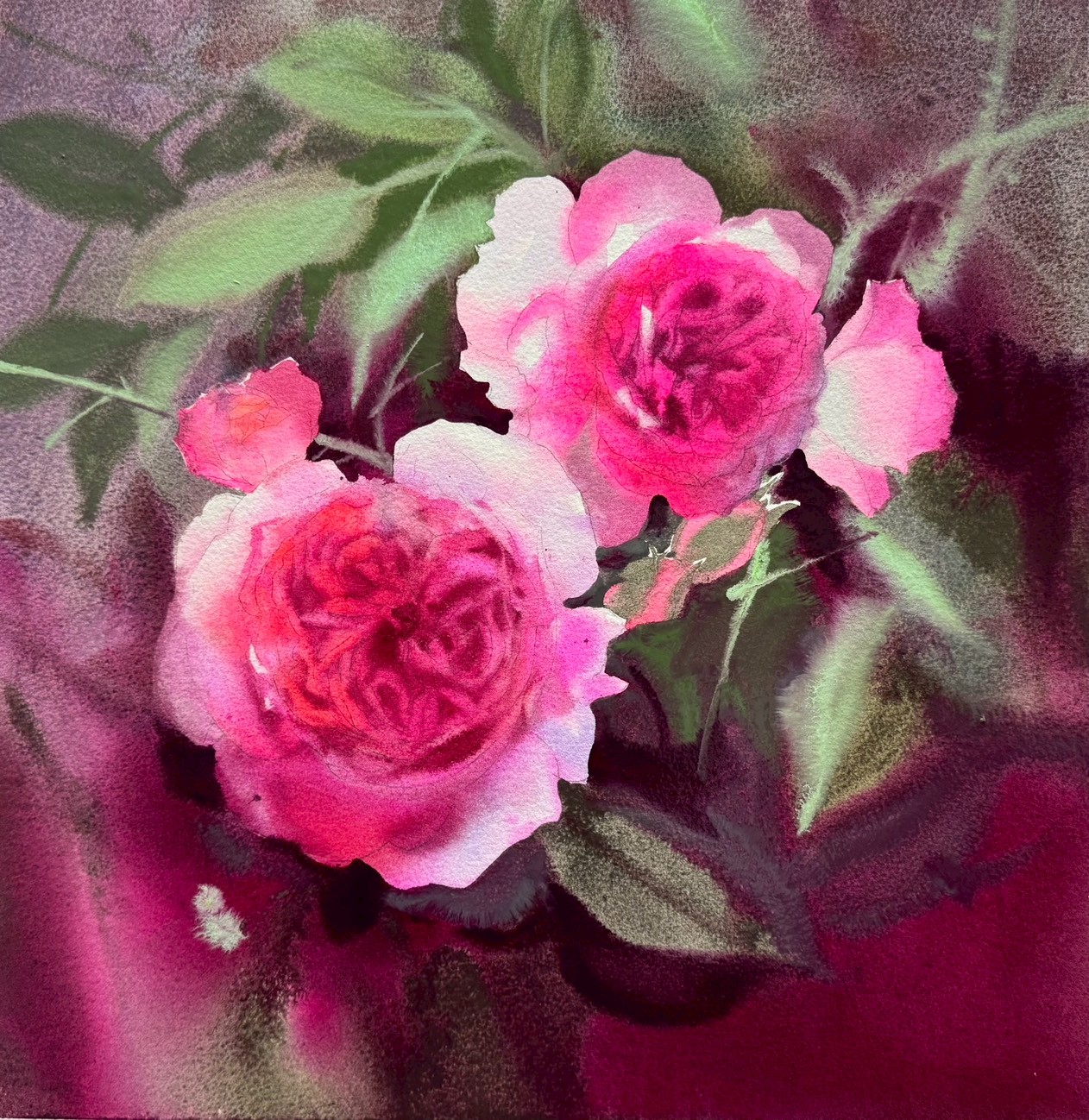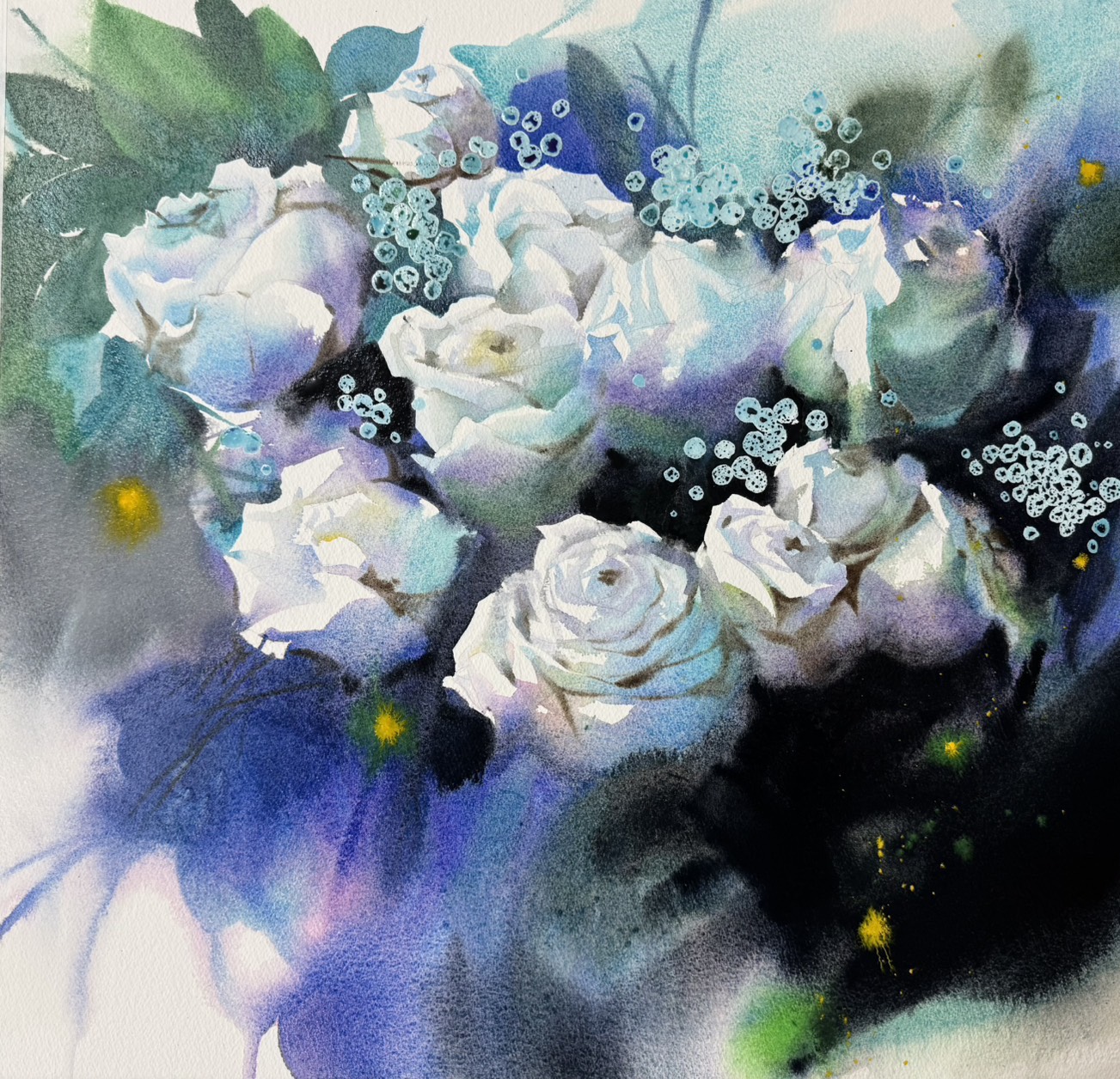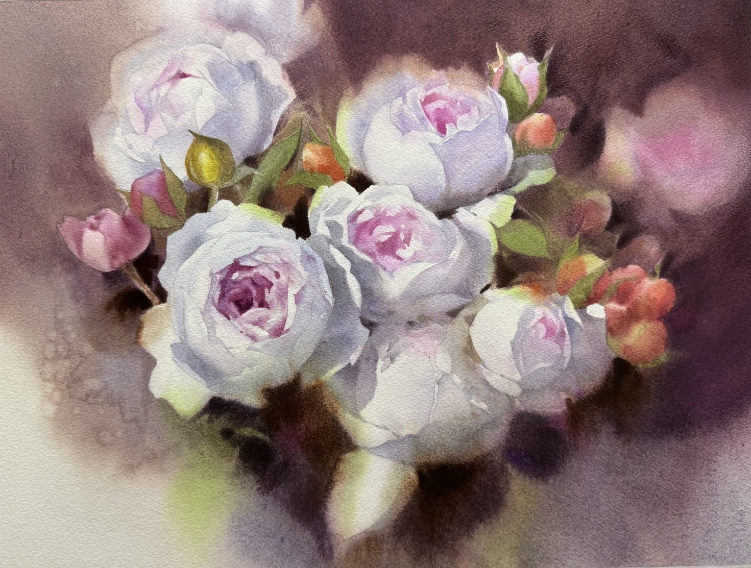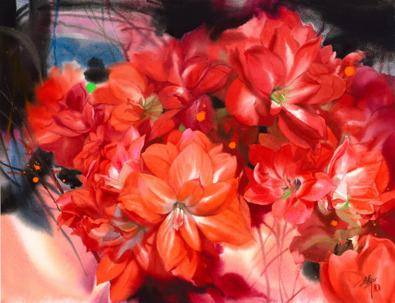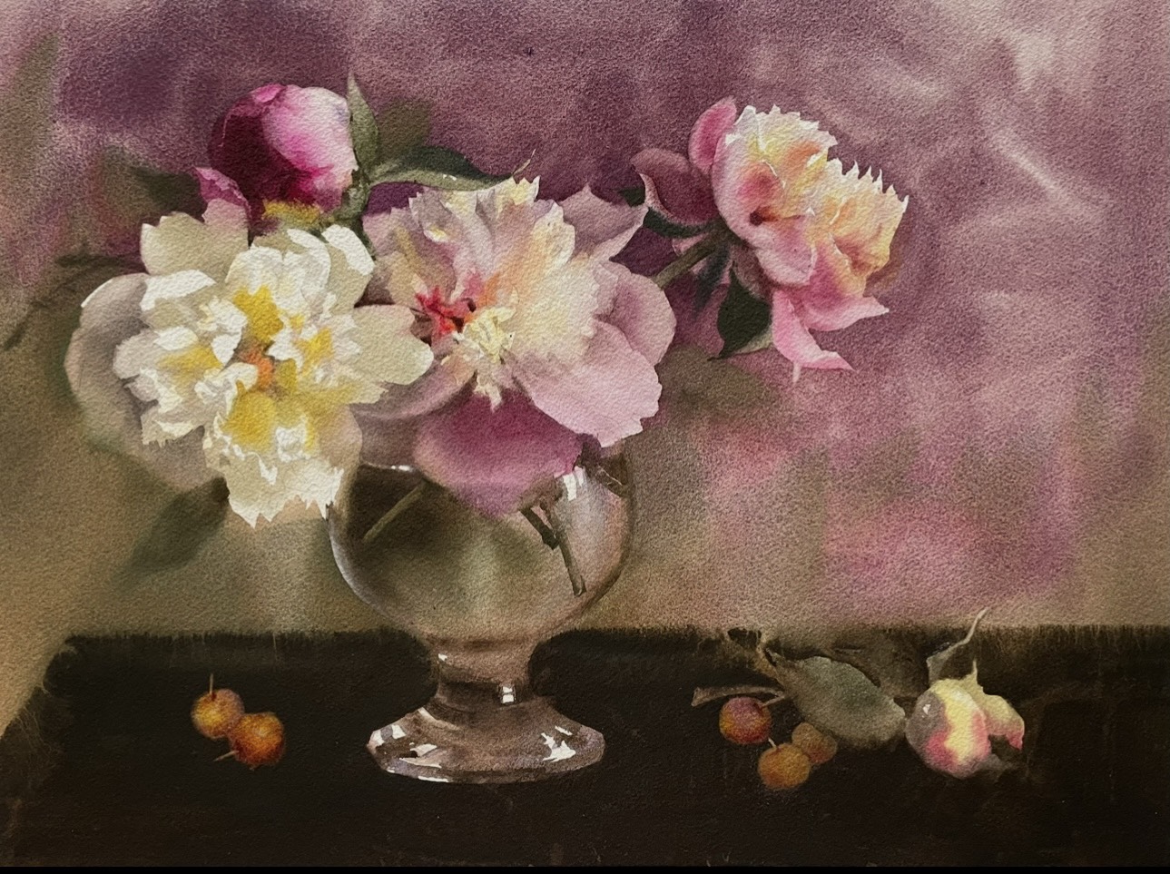 金莉老師擅長使用水彩創作,尤以花卉題材最為出類拔萃,對於花卉結構的精確掌握,使其能大膽運用高飽和度的色彩而不失雅致,精采的光影對比營造出戲劇張力的畫面,不論是晨間玫瑰的溫柔光茫,或重瓣牡丹深邃的暗部層次,皆展現出深厚的控水功力與色彩哲學。從清晨的初露到午後的驕陽,在藝術家匠心獨運的演繹下,捕捉每一朵玫瑰最動人的瞬間。