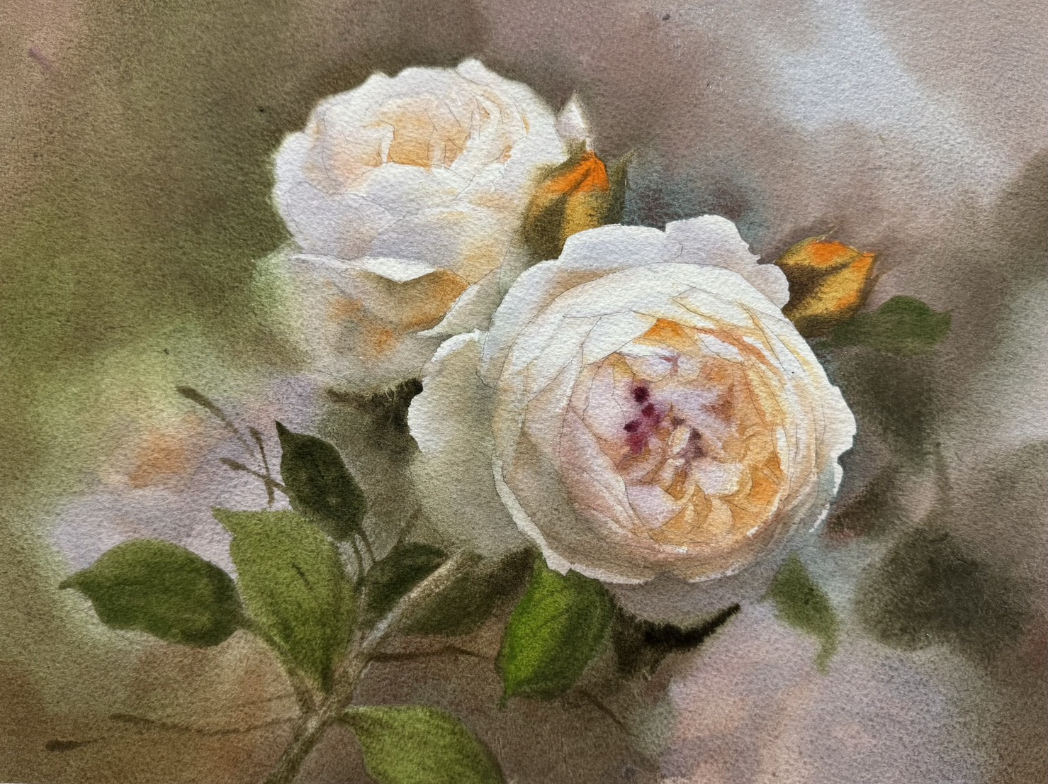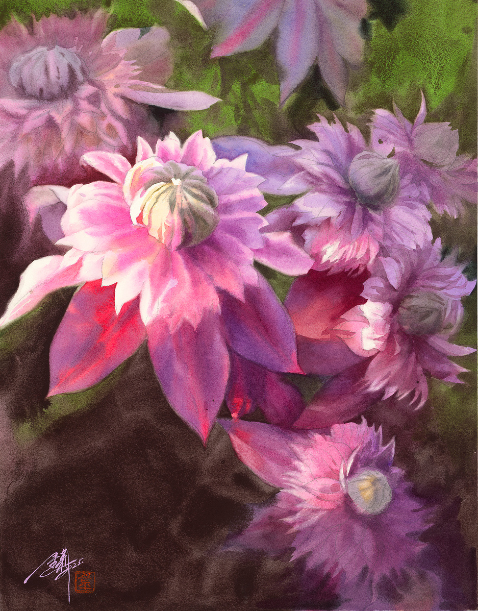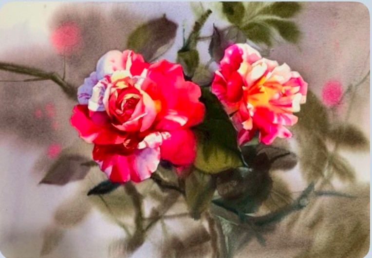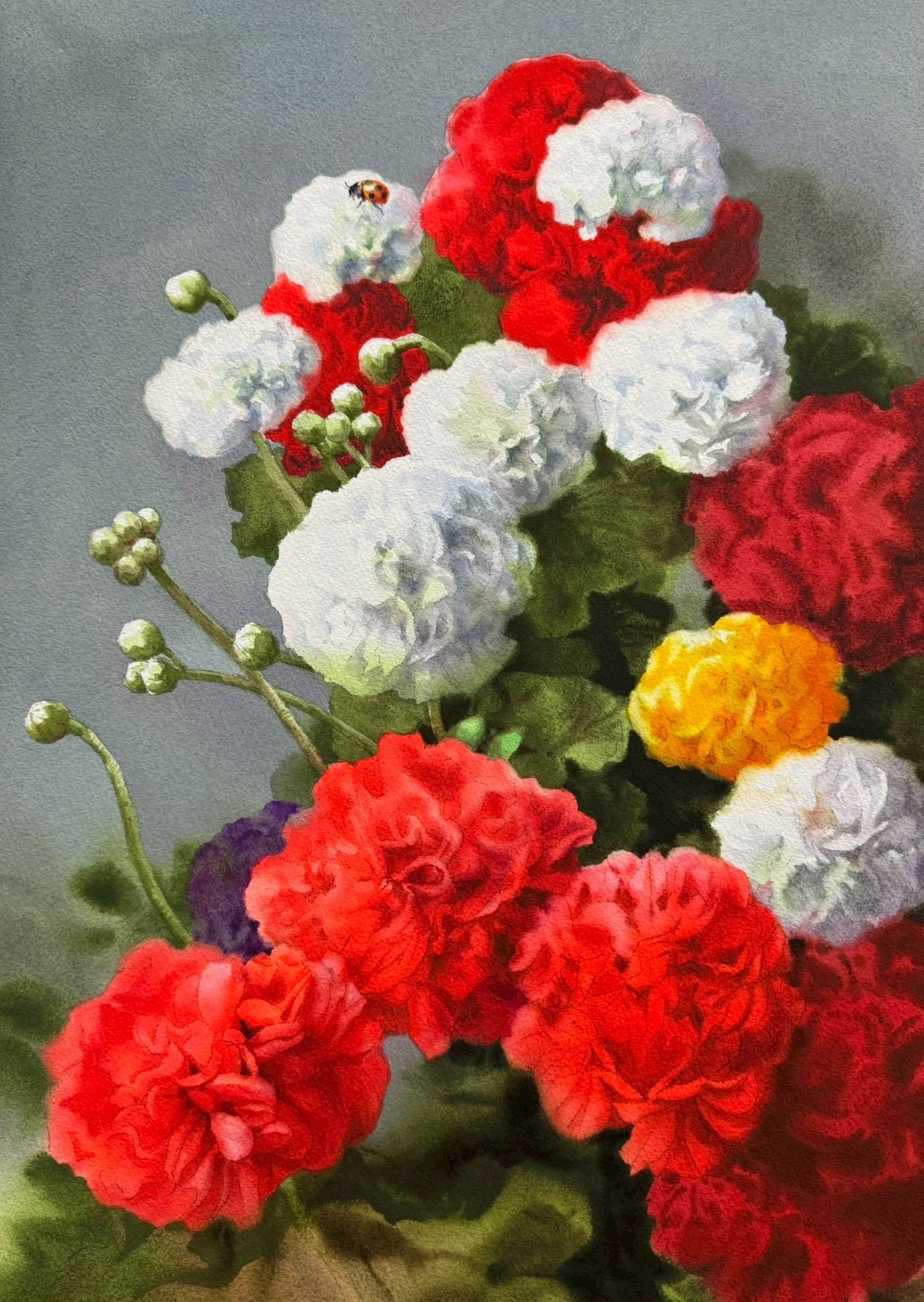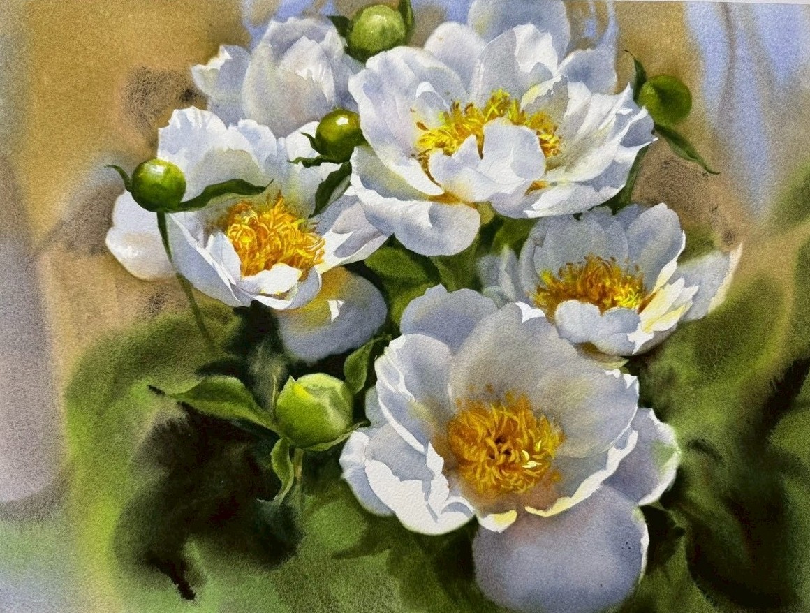金莉老師擅長使用水彩創作,尤以花卉題材最為出類拔萃,對於花卉結構的精確掌握,使其能大膽運用高飽和度的色彩而不失雅致,精采的光影對比營造出戲劇張力的畫面,不論是晨間玫瑰的溫柔光茫,或重瓣牡丹深邃的暗部層次,皆展現出深厚的控水功力與色彩哲學。從清晨的初露到午後的驕陽,在藝術家匠心獨運的演繹下,捕捉每一朵玫瑰最動人的瞬間。