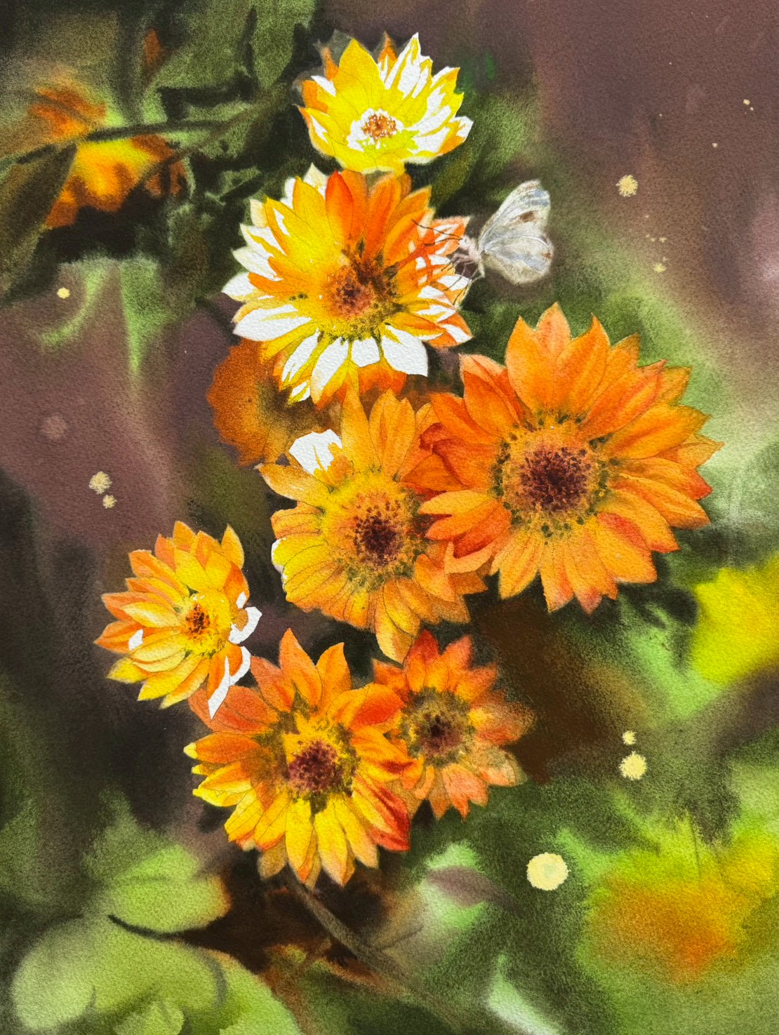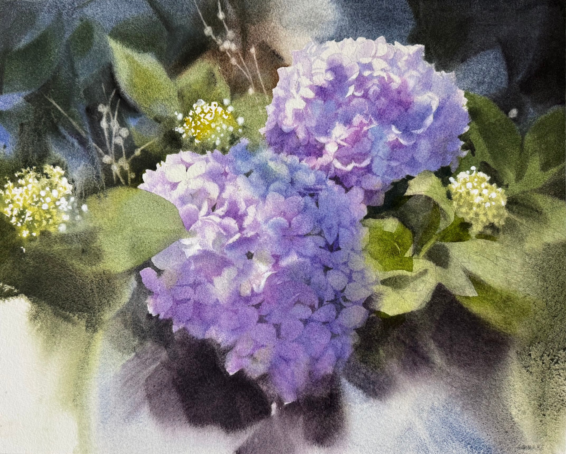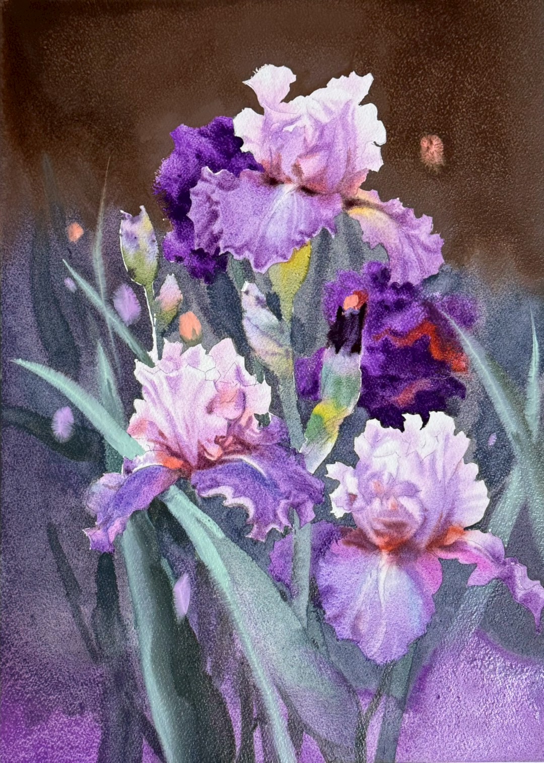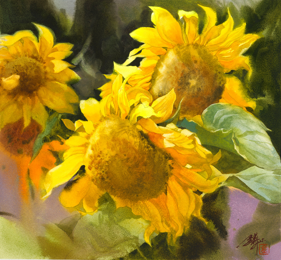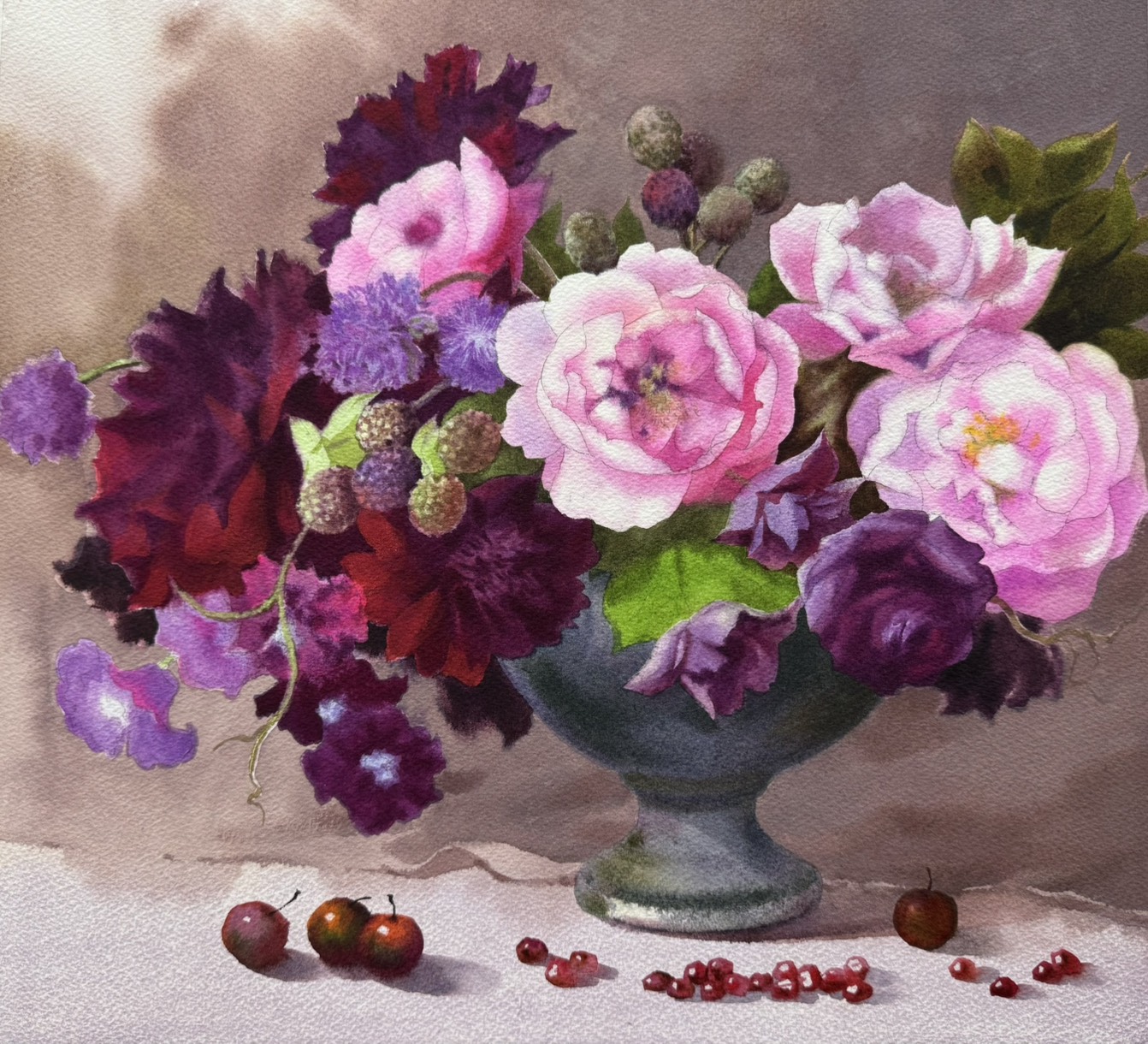 金莉老師擅長使用水彩創作,尤以花卉題材最為出類拔萃,對於花卉結構的精確掌握,使其能大膽運用高飽和度的色彩而不失雅致,精采的光影對比營造出戲劇張力的畫面,不論是晨間玫瑰的溫柔光茫,或重瓣牡丹深邃的暗部層次,皆展現出深厚的控水功力與色彩哲學。從清晨的初露到午後的驕陽,在藝術家匠心獨運的演繹下,捕捉每一朵玫瑰最動人的瞬間。